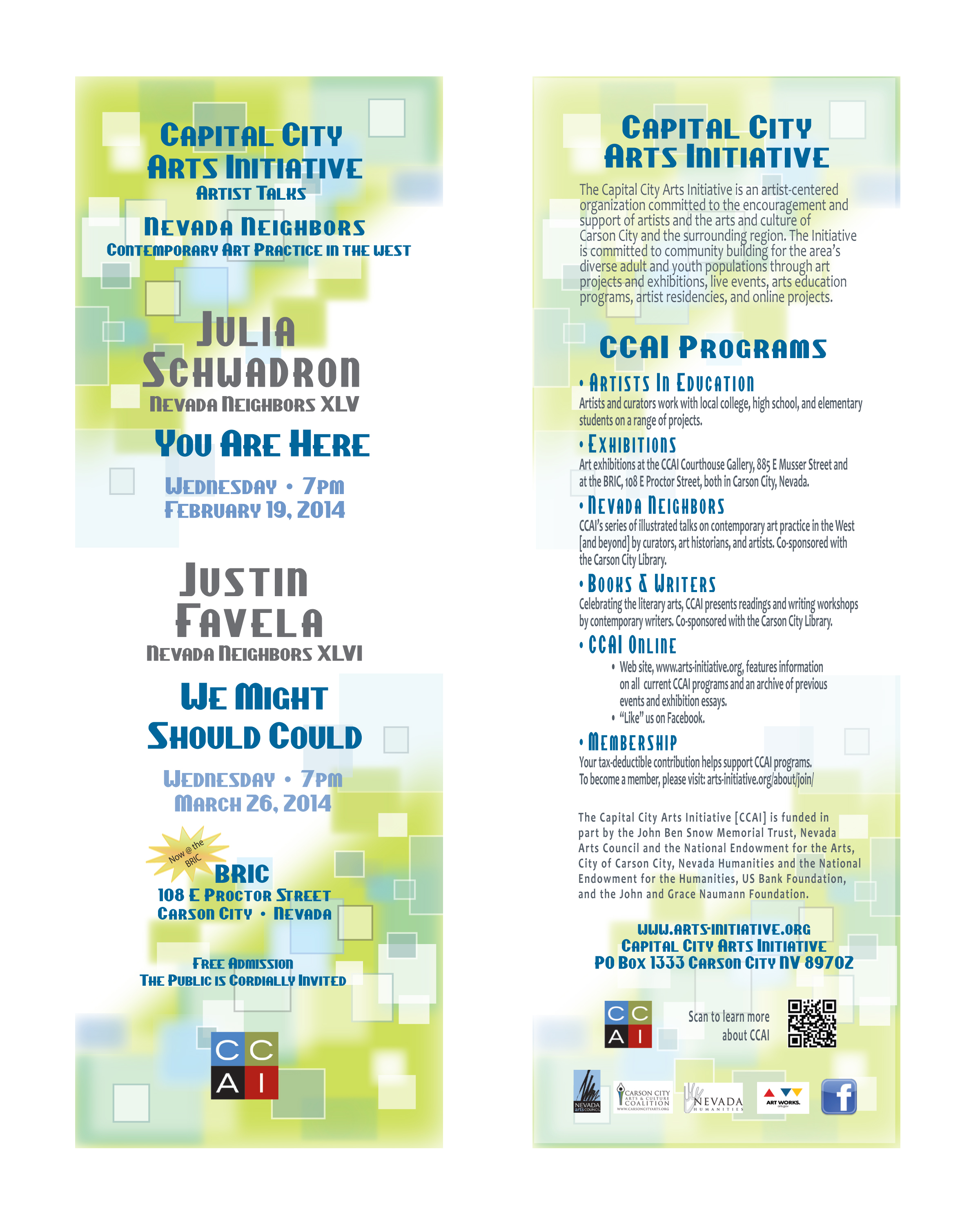The Capital City Arts Initiative is an artist-centered organization committed to the encouragement and support of artists and the arts and culture of Carson City and the surrounding region. The Initiative is committed to community building for the area’s diverse adult and youth populations through art projects and exhibitions, live events, arts education programs, artist residencies, and online projects.