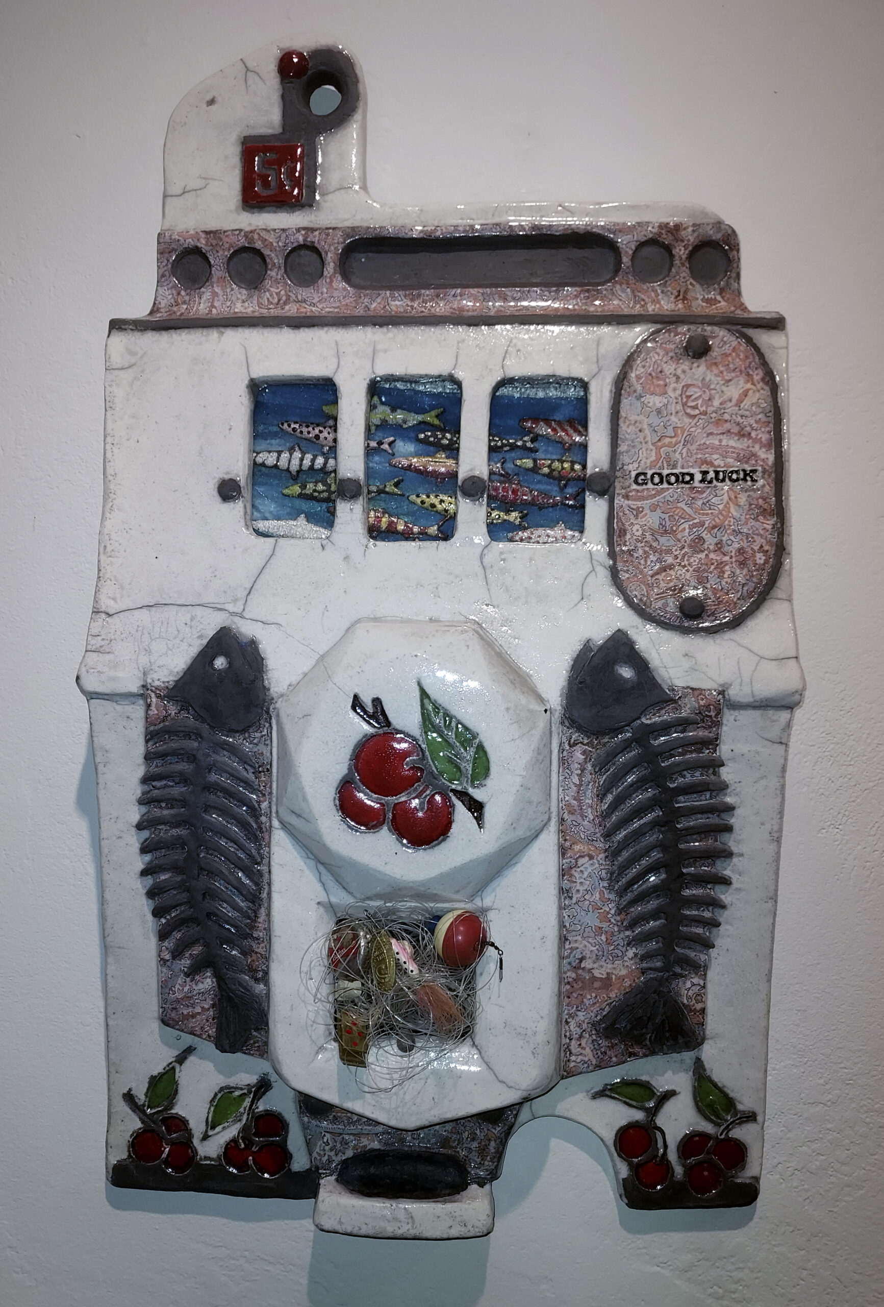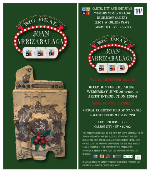 Joan Arrizabalaga has been creating and showing her art for over four decades. Arrizabalaga creates both sculptural pieces and flat work using clay, wood, metal, fabric, machine and hand embroidery, and found objects. Known for artwork about Nevada and the Casinos, she also makes use of common gaming materials such as felt, dice, and cards.