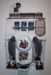 image, top right: Il Gioco d’Azzardo (Game of Chance), mixed media, coins, 8’x12′
