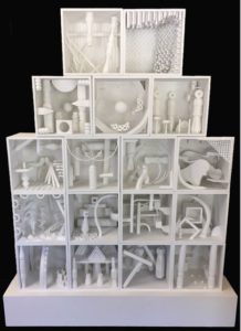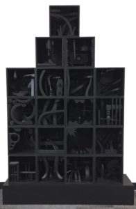 This past semester, thirty-six University of Nevada, Reno [UNR] students collaborated to create two large sculptures inspired by Louise Nevelson, one of America’s most distinguished artists. Each student built a wood box and created their own composition of gathered found-wood pieces; the boxes were then combined into the large sculptures. Nevelson provides the inspiration for students to explore formal elements of sculpture – mass, plane, line, color, and texture, along with compositional elements including positive and negative space, directional quality, and repetition.