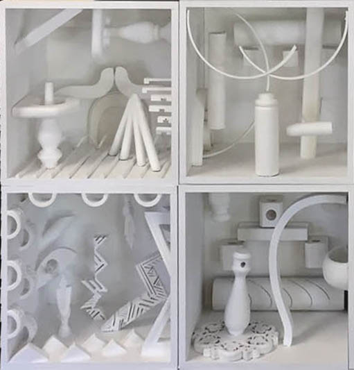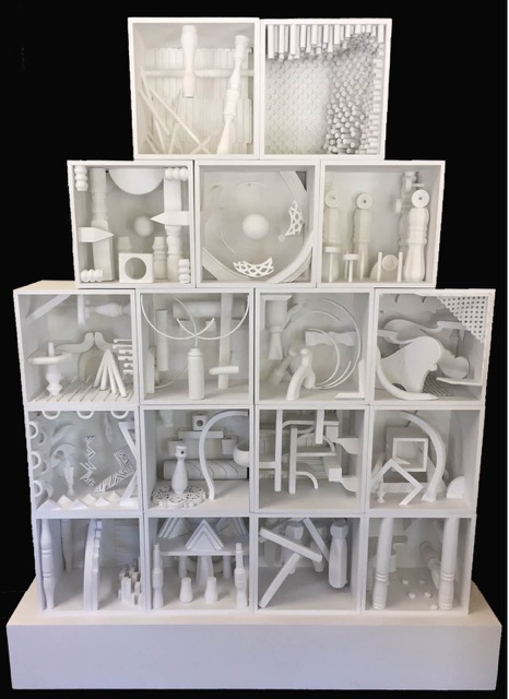 top image: Composition in White; sculptures by 17 students; wood, glue, found objects, paint; 2017