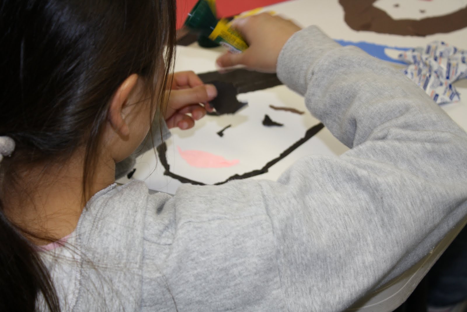 The image: student creating her art in the torn-paper self-portraits workshop; the art history section of the lesson showed students examples of artists’ portraits from the early 20th century avant-garde.