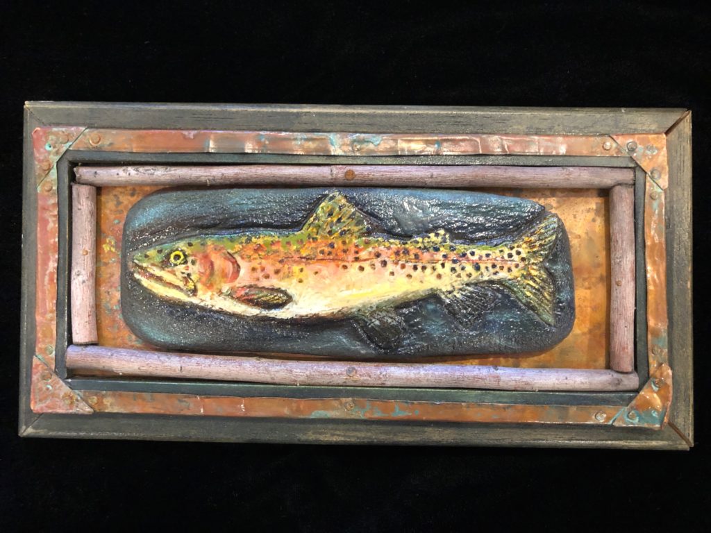 Mike Malley, Cutthroat #17; ceramic, oils, wood, copper; 2012; 6″x11.5″