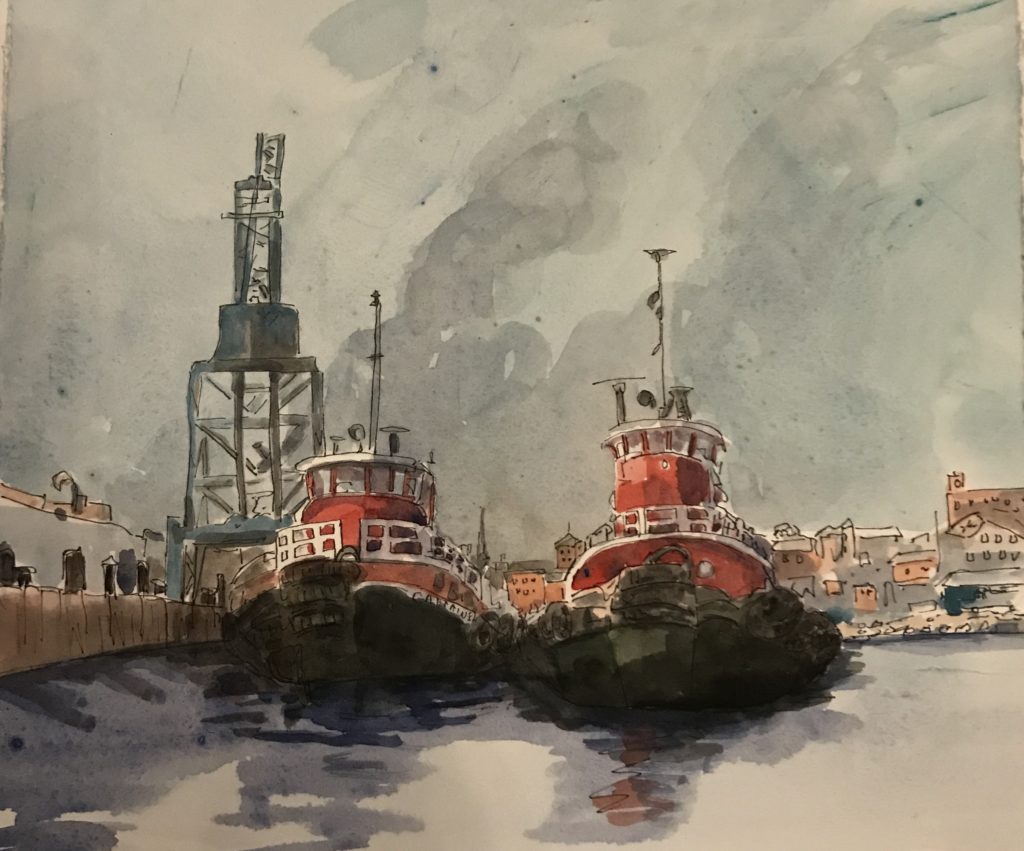 Cyndy Brenneman, “Two Tugs in Portsmouth NH”, watercolor on paper,