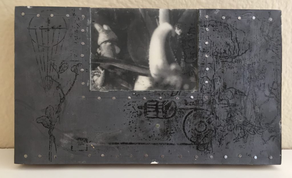 Tom Gilbertson, “Diego and Frida”, lead plate on wood, edition 2/5, image 5″x8.5″, 1998