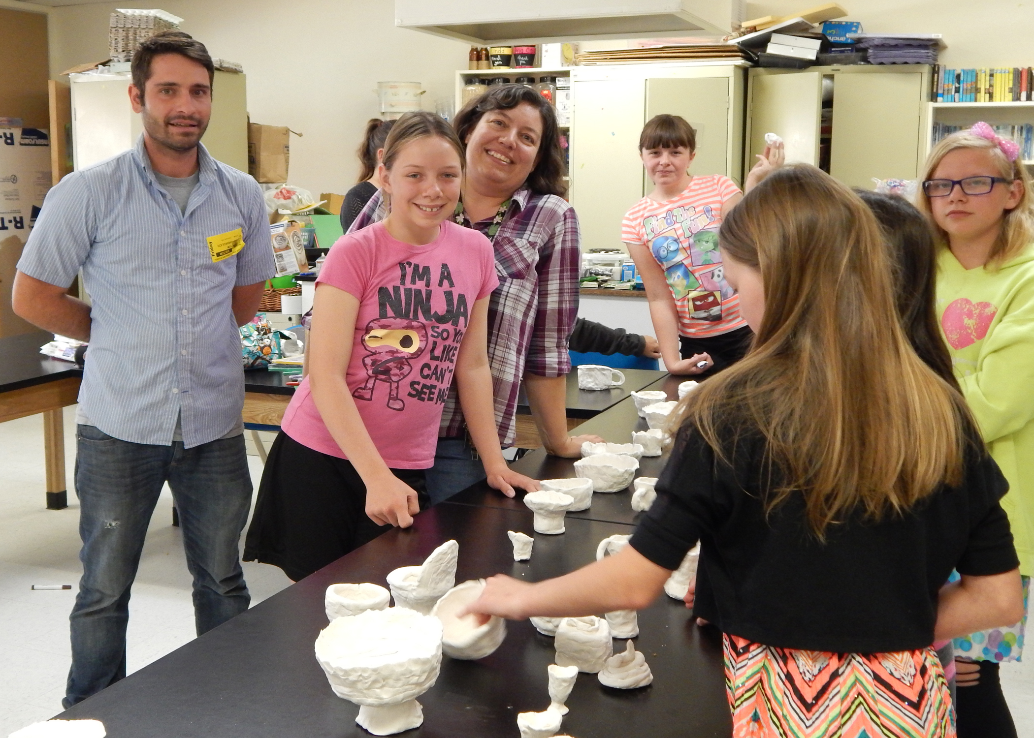 Tom Drakulich and teacher Rachel Leach with her SSES students and their ceramics, 5/13/16