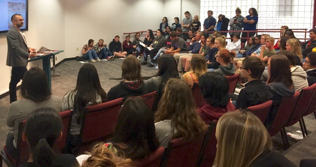 Nevada Neighbors speaker Paul Baker Prindle giving his talk to Dayton High art students, Dayton, NV, 3/24/16; with support from Healthy Communities Coalition of Lyon and Storey Counties