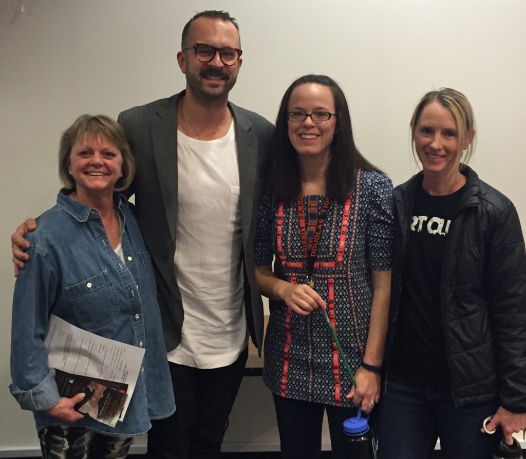 Paul Baker Prindle after his talk with Douglas High Art faculty [l-r] KC Brennan, Zoe Shorten, Kelley Yost, 4/22/16