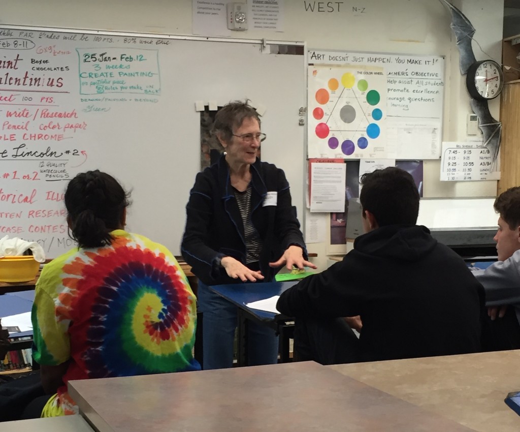 Katie Lewis talking about her art to students at Dayton High, Dayton NV, 11/10/15