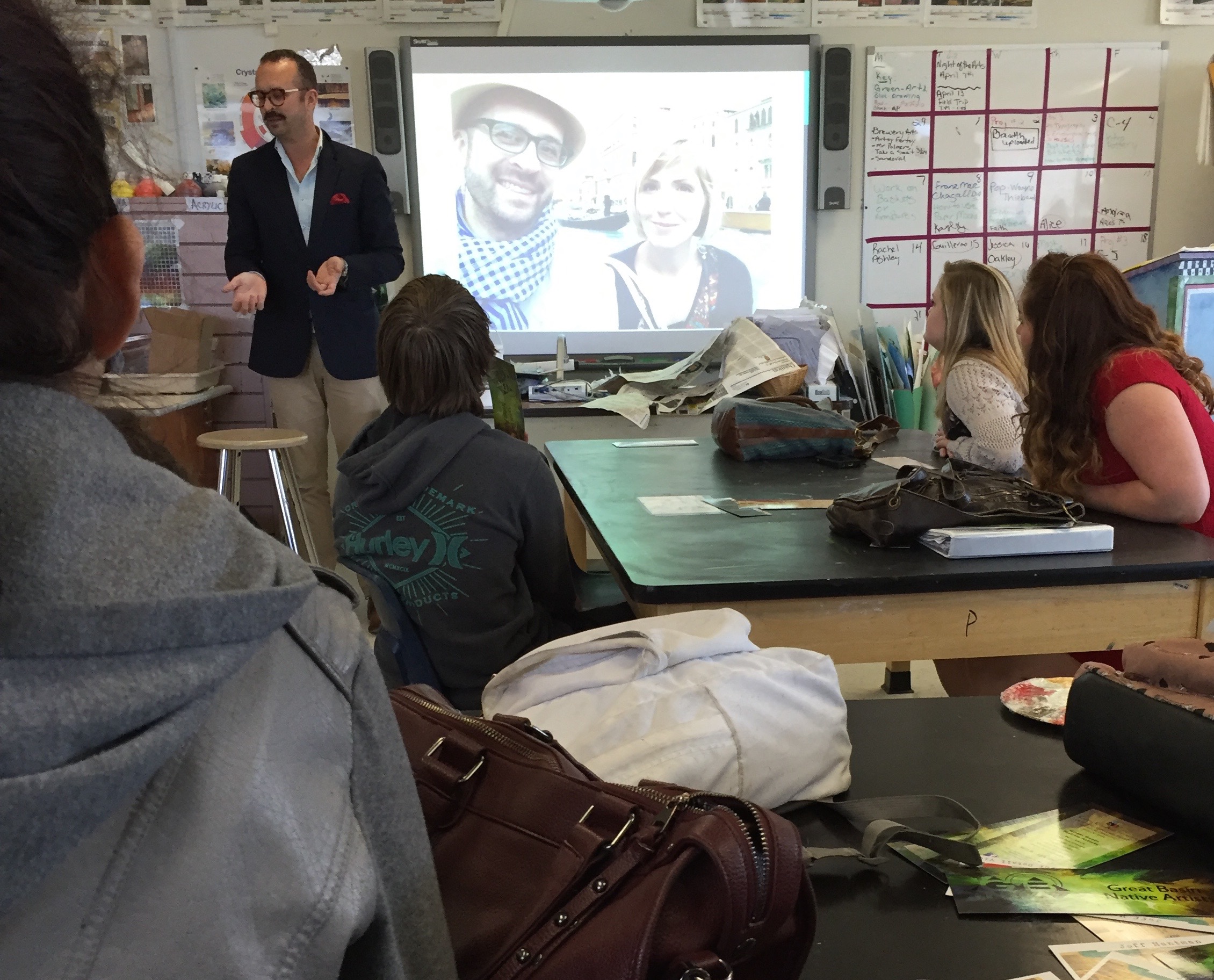 Nevada Neighbors speaker Paul Baker Prindle giving his talk to Dayton High art students, Dayton NV, 3/24/16