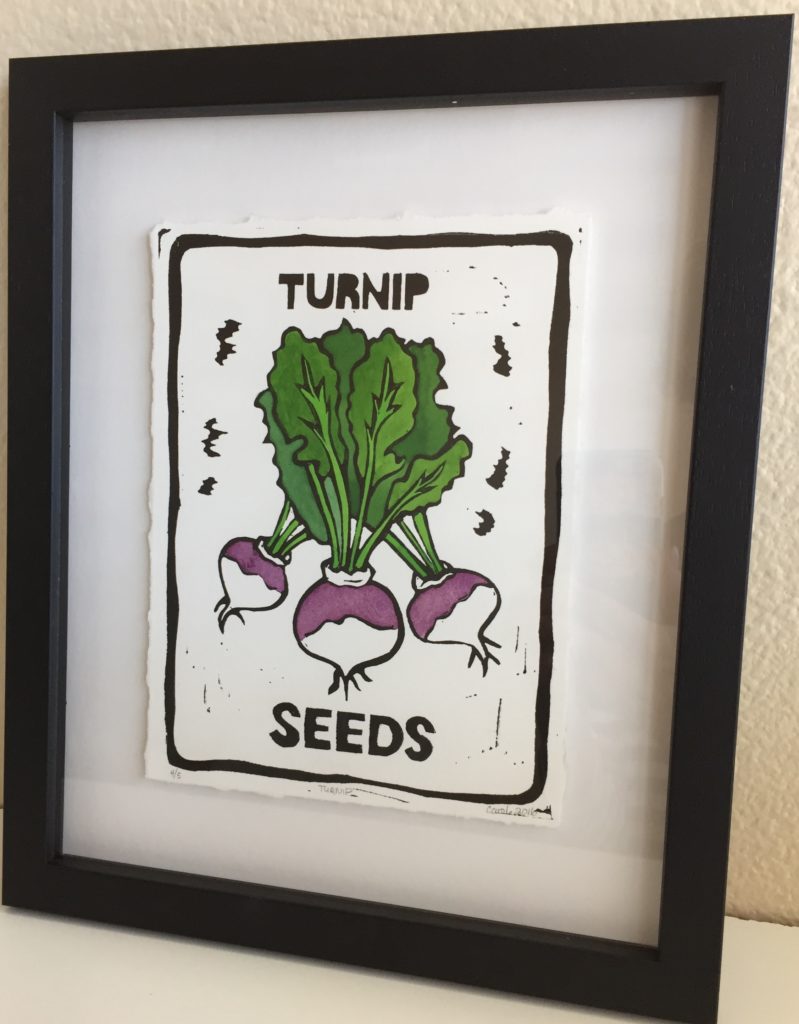 “Turnip Seeds”, Carol Brown, handcolored relief print, image: 10″x8″, 2016