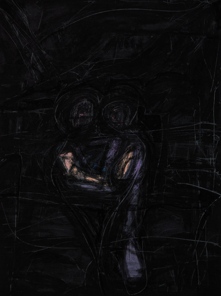 “Staring Contest: Loser Does the Dishes”, Tom Drakulich, pastel, charcoal, graphite on paper, 25″x19″, 2016