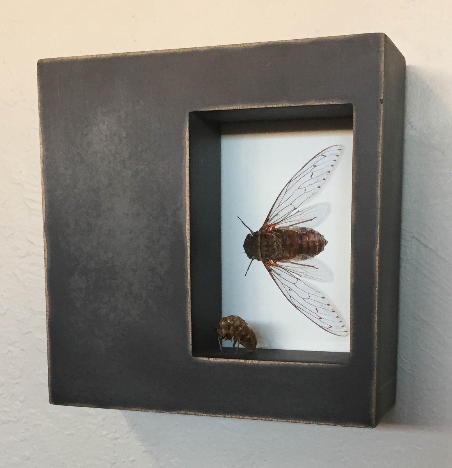 “Shed Your Skin/Spread Your Wings”, Tamara Scronce, cicada [shed exoskelton], archival pigment print, glass, wood, paint, 7″x7″x2″, 2017