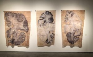 3rd image: Chronic Traumatic Encephalopathy (CTE) 1 – 3; thread on stained tea bag papers, netting; 2018; installation view, Haldan Art Gallery, Lake Tahoe Community College, South Lake Tahoe, CA, 2019