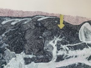 Chung bases her work on enlarged MRI medical scans for their beauty and universality. She searches for images on the Internet or receives them from friends and acquaintances; she and then converts and manipulates the images using Photoshop. After transferring and enlarging the MRIs onto a water-dissolvable film, she uses multiple-colored threads to machine embroider and create the desired values and hues. She sews on different substrates including used tea bag papers, mulberry, and rice papers to convey a sense of fragility and impermanence. The enlarged pieces invite the viewer to become a part of the experience. Photographs of her work are available at http://paulachung.com/