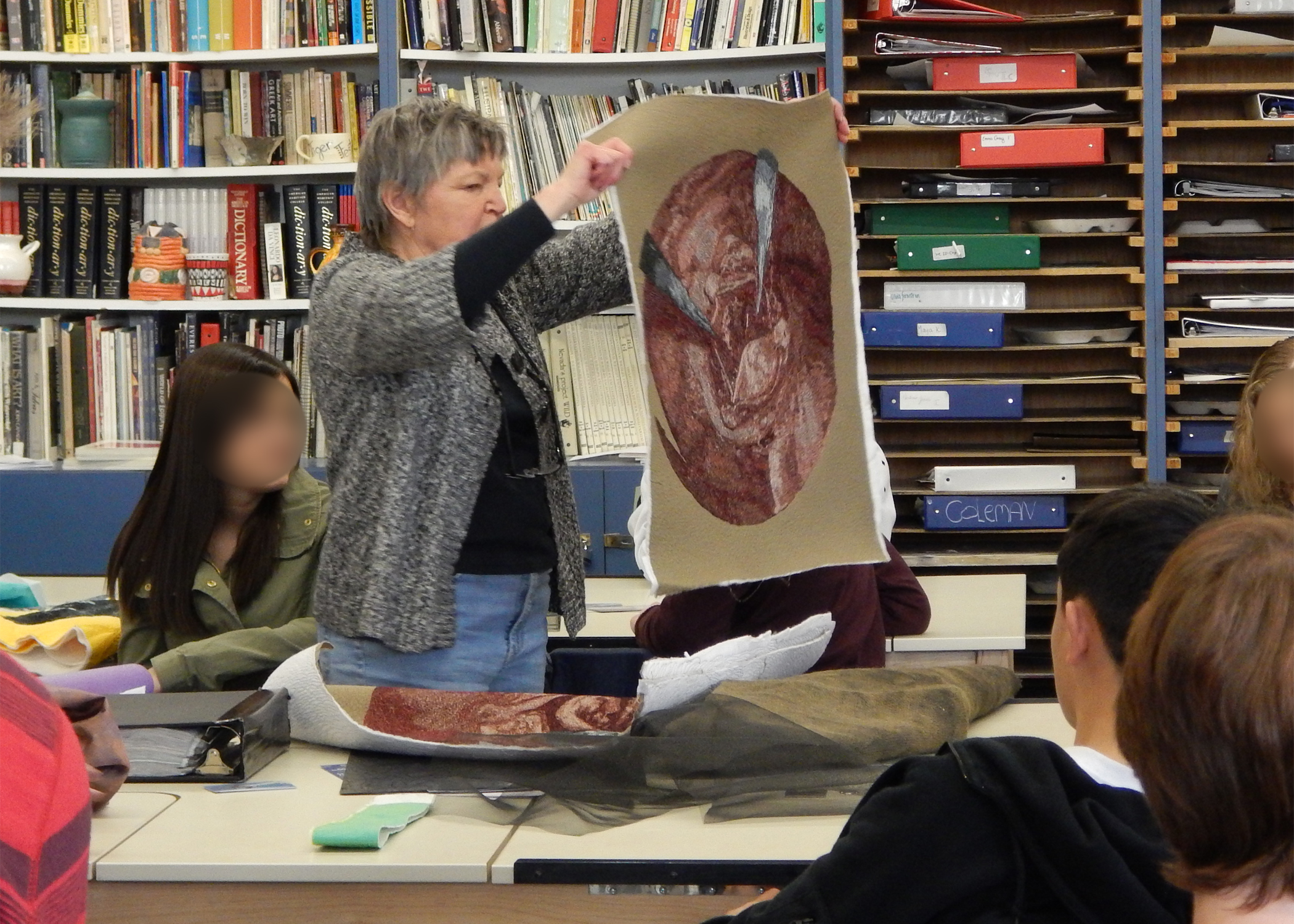 fourth image: Chung showing her color wheel binder of fabric dyes to Carson High teacher Mike Malley
