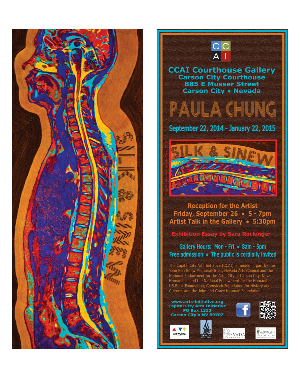 The Capital City Arts Initiative [CCAI] announces its exhibition, Silk & Sinew, by artist Paula Chung at the CCAI Courthouse Gallery from September 22, 2014 – January 22, 2015. CCAI will host a reception for the artist on Friday, September 26, 5-7pm. The Courthouse is located at 885 E Musser Street, Carson City. The reception and the exhibition are free and the public is cordially invited. The gallery is open to the public Monday – Friday, 8am – 5pm.