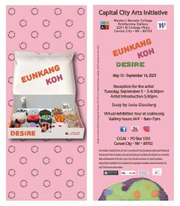 The exhibit is open to the public May 15 – September 14, 2023, Monday through Friday, 8am – 7pm, in Western Nevada College’s Bristlecone Gallery, 2201 W College Parkway, Carson City. Visit the gallery over the summer and then return on Tuesday, September 5, 5pm – 6:30pm for the artist’s reception; the artist introduction is at 5:30pm. Watch the video of Eunkang Koh’s interview and exhibition tour here: https://www.youtube.com/watch?v=aENNYLkpQXM