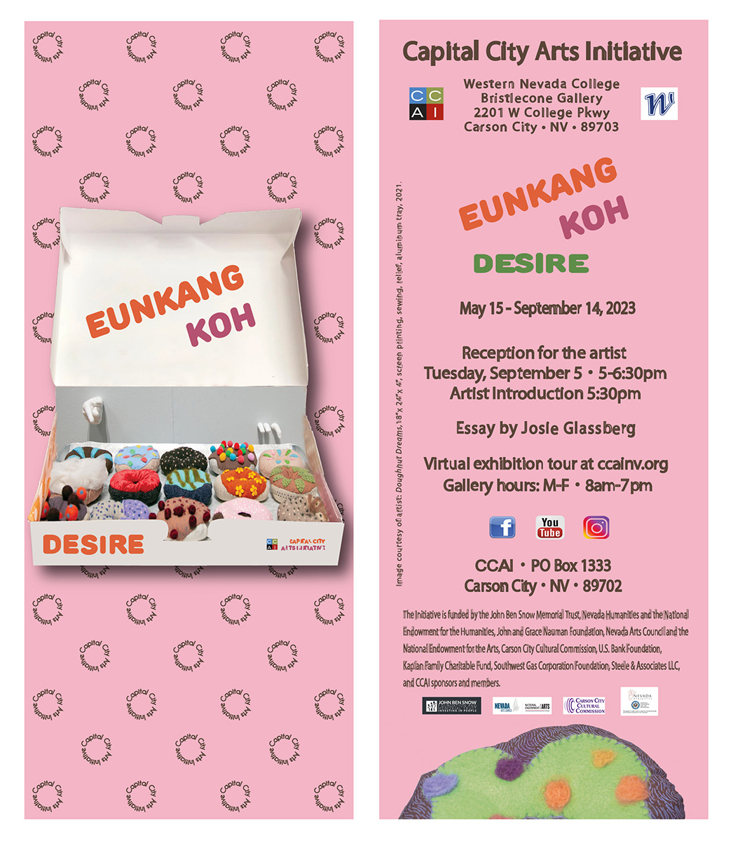 The exhibit is open to the public May 15 – September 14, 2023, Monday through Friday, 8am – 7pm, in Western Nevada College’s Bristlecone Gallery, 2201 W College Parkway, Carson City. Visit the gallery over the summer and then return on Tuesday, September 5, 5pm – 6:30pm for the artist’s reception; the artist introduction is at 5:30pm. Watch the video of Eunkang Koh’s interview and exhibition tour here: https://www.youtube.com/watch?v=aENNYLkpQXM