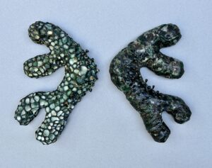 Parks’ work depicts a cross of desert succulents and marine corals that the Disney fantasies missed. She said about her work, “I create organic hand-built ceramic objects of contemplation derived from my years of engagement with the desert landscape. In this series of ceramic sculptures, I take into account my shifting perspectives of the vast landscape and the closely observed details of the desert. The making process involves very detailed manipulation of each piece to create highly realized forms with a timeless quality. In part, the forms are invented during the process of making. I am fascinated when forms in nature seem to cross between categories. For instance, many actual tufa formations resemble animal and human forms. In some of my pieces, I focus on a surface rock texture, with limbs that create an animated, creaturely form. The textures of many of these pieces come from direct observation of the incredible variety of tufa rocks. I like to create forms that defy strict categorization, allowing the viewer to spend time thinking about what a piece looks like to them and engaging with the form, perhaps being reminded of time spent in nature. My goal is to bring to mind the vitality and spirit of the landscape.”