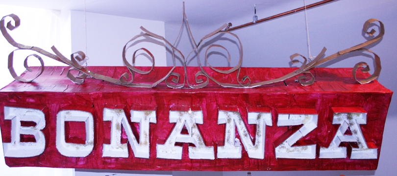 light bulbs, pulsing electricity, metal, neon, and mammoth scale, he uses a street vernacular of common cardboard, wire, glue, glitter, bed sheets, and paint to recreate the signs listed in the show’s title: Mark Twain, Suicide Table, Blood Bucket, Ghost, Bonanza, and Amen. He reproduced Amen from a sign he found in St. Mary’s Catholic Church and Ghost from a Fourth Ward School sign.
