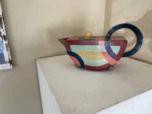 right image: Susan Paigen, Homage to Frank Stella, ceramic, 12”x7”x4”, 2023