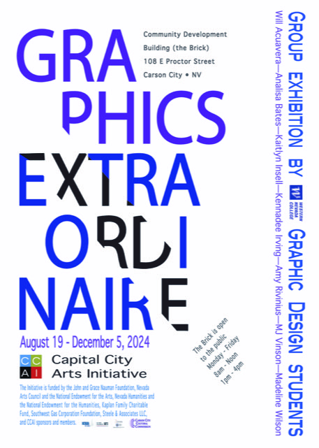 Graphics Extraordinaire 2024 shows posters by graphics students from WNC’s Carson City campus. Participating students include Will Acuavera, Analisa Bates, Kaitlyn Insell, Kennadee Irving, Amy Rivinius, MJ Vinson, and Madeline Wilson.