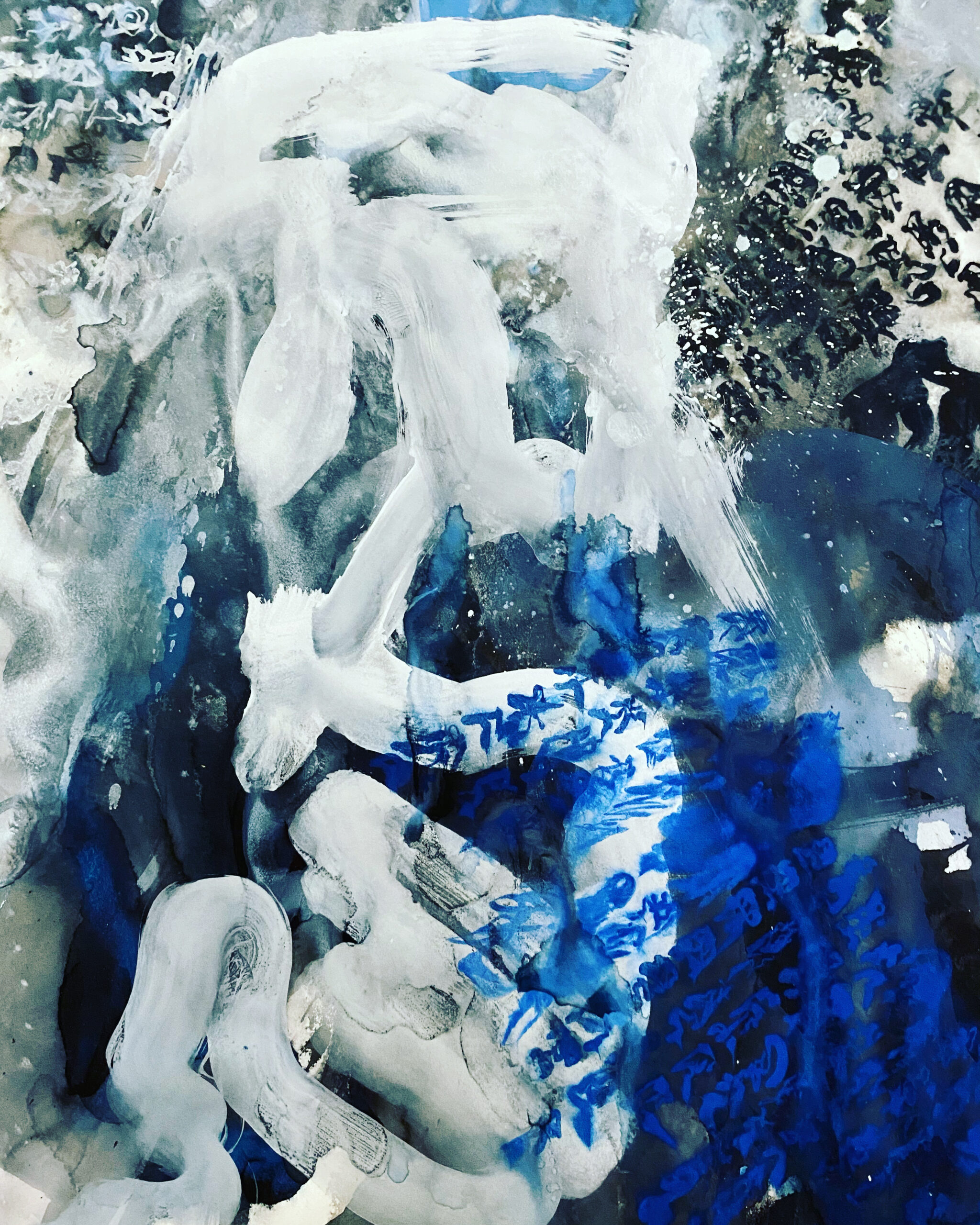 top image, right: Gwaylon Leaf, The River Crashes Against the Stone, 4’x6′, watercolor on paper, 2021
