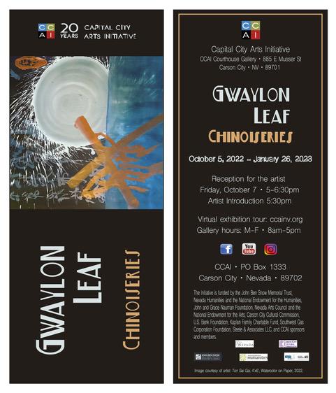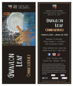 The exhibition runs at the Courthouse Gallery from October 5, 2022 – January 26, 2023. CCAI will host a reception for the artist on Friday, October 7, 5:00 – 6:30pm with the artist introduction at 5:30pm. The Courthouse is located at 885 E Musser Street, Carson City; the gallery is open Monday – Friday, 8:00am – 5:00pm. Watch the gallery interview with Leaf at https://youtu.be/Qr1bMT2kDUY
