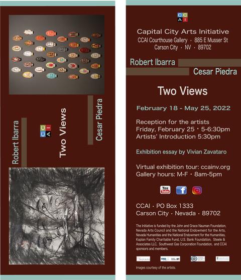 The exhibition runs at the Courthouse Gallery from February 18 – June 2, 2022. The Courthouse is located at 885 E Musser Street, Carson City; the gallery is open Monday – Friday, 8am – 5pm. CCAI will host a reception for the artists on Friday, February 25, 5 – 6:30pm, artists’ introduction at 5:30pm. Watch the artists’ interview here https://youtu.be/mjYDJK9w4r8