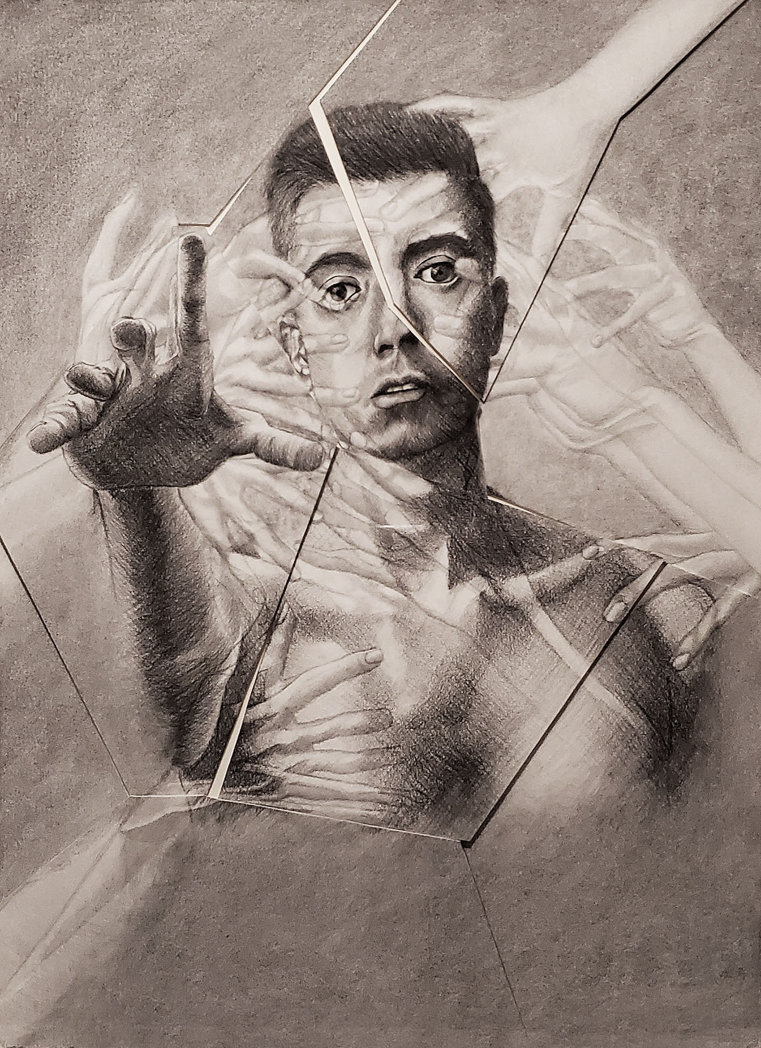 Robert Ibarra’s work involves self-portraiture where he investigates emotions tied to his personal experiences. He said, “My drawings involve the human figure and attempts to find a balance between realism and abstraction to convey emotion that is tied to personal experiences. My work serves as a way to relate to and evoke genuine reactions and feelings from the viewer. I want to provide viewers with an opening for dialogue about their own personal struggles.
