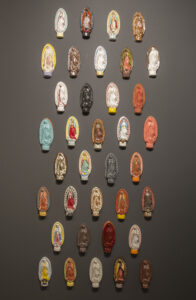 top image, right: Cesar Piedra, The Cult of the Virgin of Guadalupe; installation view; low/mid/high-fired Black Mountain, Porcelain, Stoneware, Terracotta; 2020-2021