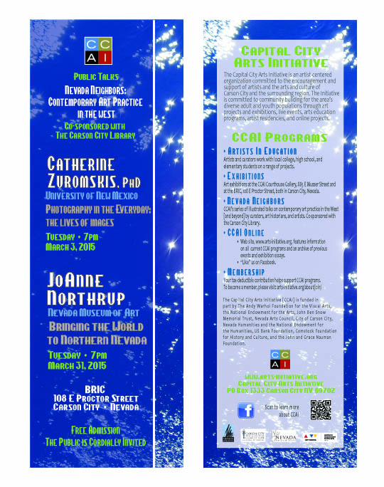 The Carson City Library co-sponsors the Nevada Neighbors series with CCAI. The Capital City Arts Initiative [CCAI] is funded in part by The Andy Warhol Foundation for the Visual Arts, National Endowment for the Arts, John Ben Snow Memorial Trust, Nevada Arts Council, City of Carson City, Nevada Humanities and the National Endowment for the Humanities, U.S. Bank Foundation, Comstock Foundation for History and Culture, and John and Grace Nauman Foundation.