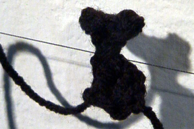 employs simple materials-black yarn and thread-crocheted into ten rows of eighty