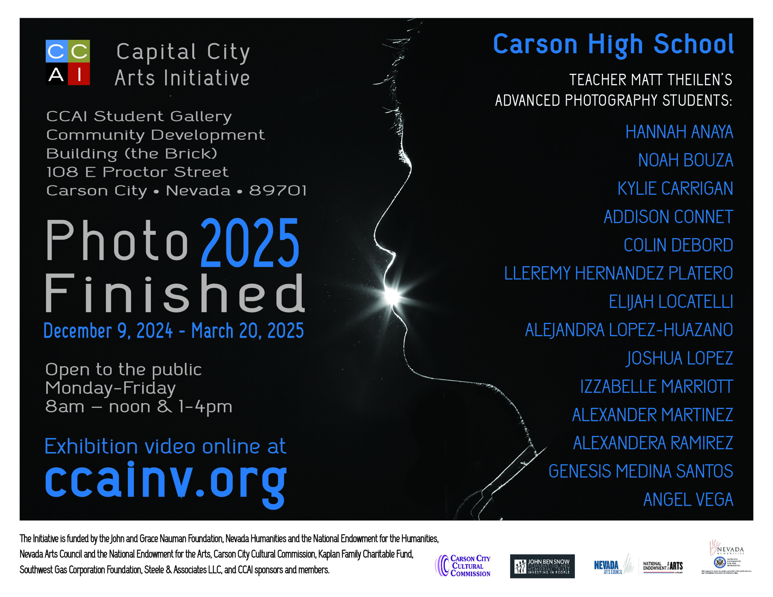 Photo Finished 2025, a Capital City Arts Initiative (CCAI) student exhibition, is in the Community Development Building (the Brick), 108 E Proctor Street, Carson City, December 9, 2024 – March 20, 2025. The Brick is open to the public, M-F, 8am – noon, 1-4pm. Click here to watch the artists’ interviews.