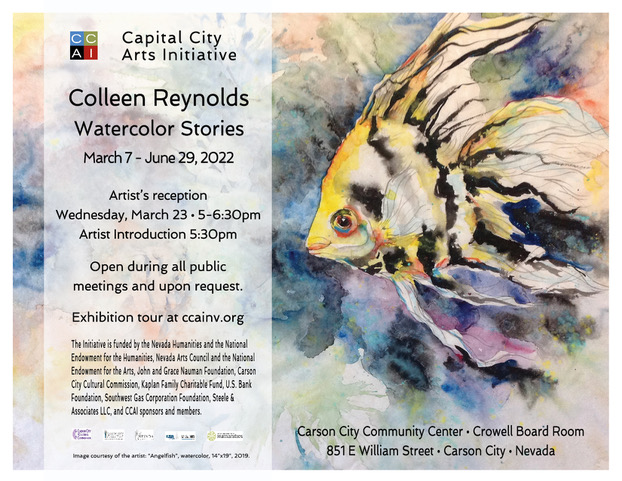 CCAI’s exhibition, Watercolor Stories, opens in the Community Center’s Crowell Board Room, Monday, March 7 and continues through June 29, 2022. CCAI will host an artist’s reception on Wednesday, March 23, 5:00 – 6:30 p.m. with the artist’s introduction at 5:30 p.m. The Community Center is located at 851 E William Street, Carson City. Watch the online exhibition tour with Colleen’s interview at https://youtu.be/2Y_aUvhscbc