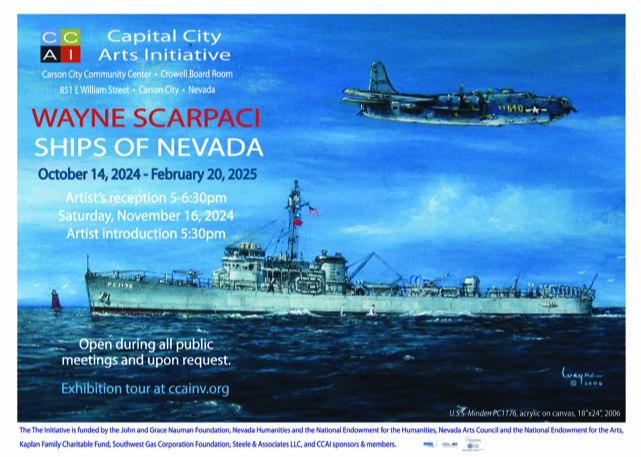 The Ships of Nevada exhibit will be in the Community Center’s Crowell Board Room, from October 14, 2024 – February 20, 2025. CCAI will host a reception for the artist on Saturday, November 16, 4–5:30pm; the artist introduction will be at 4:30pm. Scarpaci will show his video of the US Navy ships he has painted at 5pm. The Community Center is located at 851 E William Street, Carson City. The Crowell Board Room is open for all the city’s public meetings and upon request. Click https://youtu.be/xYxXB-AJ_aM to watch the gallery interview with Scarpaci.