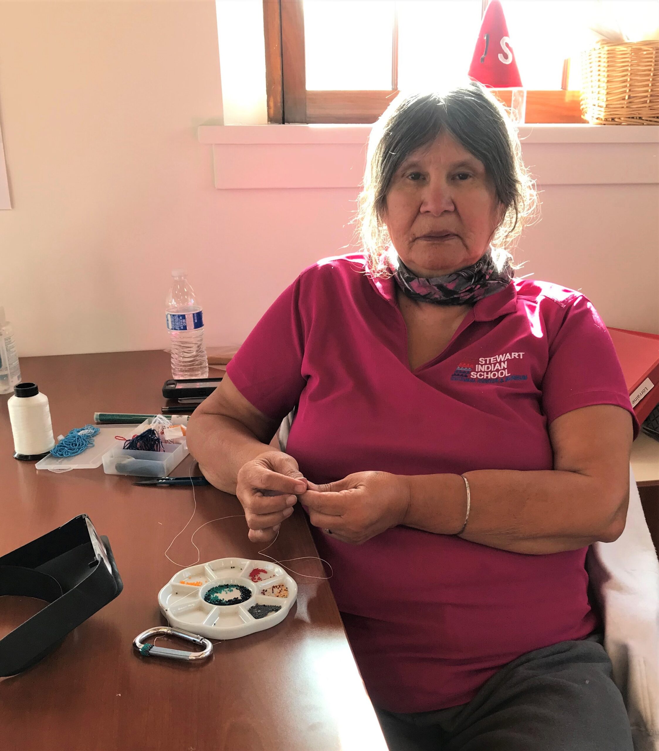 When Dale Bennett was 13 years old, she was sent to the Stewart Indian School and lived there from 1969-1973. She said, “I learned how to bead at Stewart from my maiden. I still love to bead and I have done work for various movie stars and movie directors. Beading is my passion and for the last 2 years my work has really taken off.” Bennett is from the Washoe and Paiute tribes. All through the years she has been beading and having classes for native children, her work and students’ work has excelled. Bennett volunteers at Stewart and has lived in Woodfords, CA, for the past 37 years.