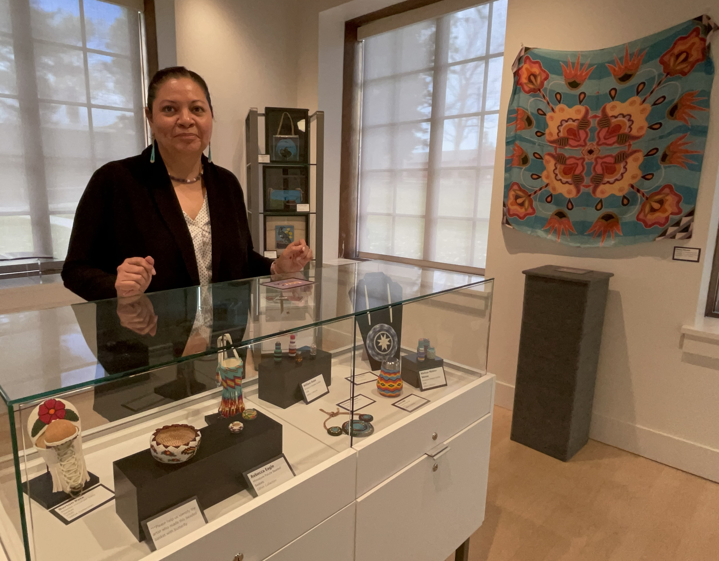 3rd image, right: artist and curator, Melissa Melero-Moose, with the Beadworks exhibition, 2021