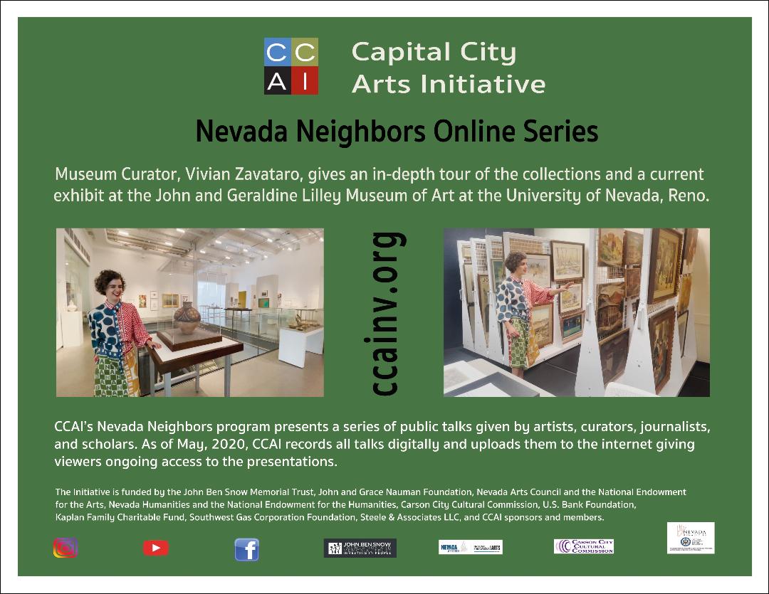 and Geraldine Lilley Museum of Art behind-the-scenes collections. The Capital City Art Initiative’s online series of Nevada Neighbors public talks includes interviews with artists or curators.
