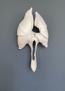 LB Buchan describes the work: “Many of my show and sculpture titles are often derived from scientific names of the things I’m currently exploring. Callosum comes from corpus callosum, which is a large nerve tract connecting the right and left hemispheres of the brain, and allows communication between the two hemispheres. In Latin, it means ‘tough body’. To give you some context/background, this body of work based on anatomy is specifically about the manifestation of post-traumatic stress in the body. The same things seem to appear over and over- primarily lungs, diaphragm, and abdominal anatomy. This isn’t consciously intentional – it is just how I work, whatever comes out is what comes out, but breath and breathing do seem to be a central focal point. Most of the pieces have a strong botanical or sea life flair to them, especially some of the larger ones I’m working on.