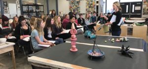left image: teacher Kelley Yost discussing the critique with students; some student sculptures in the foreground, March 2017