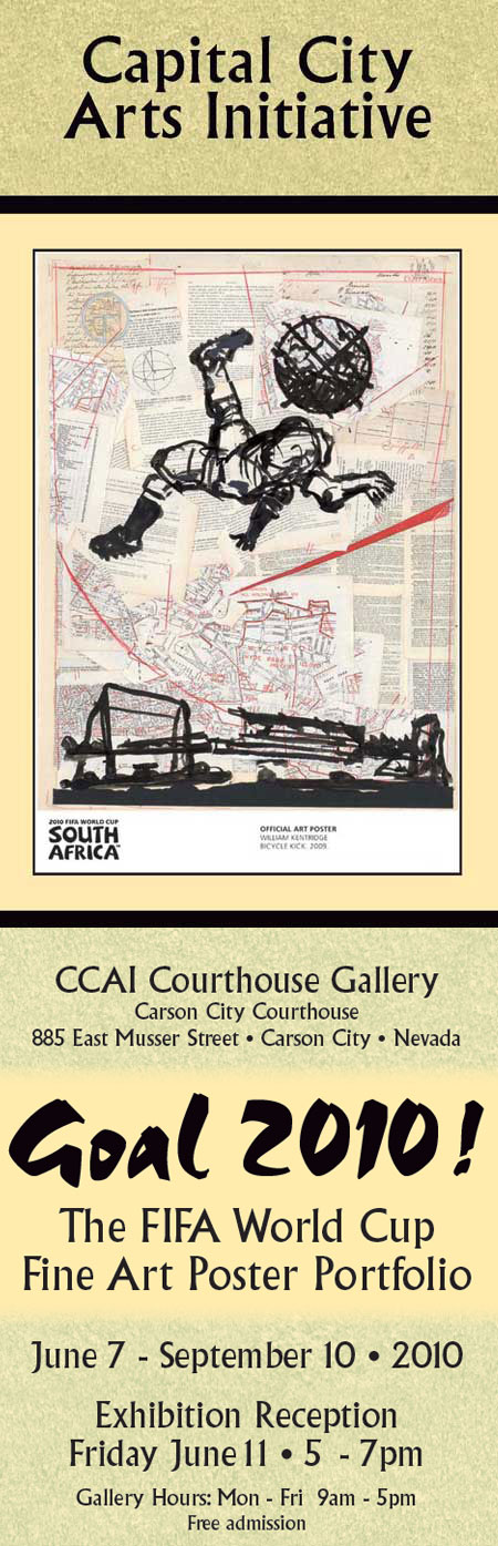 Bringing the World Cup festivities to Carson City, the Capital City Arts Initiative presents Goal 2010!, an exhibition of fine arts poster in the CCAI Courthouse Gallery. The seventeen limited edition posters go on view on Monday, June 7, with a reception on Friday, June 11 from five to seven p.m. The exhibition and reception are free and open to the public.